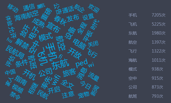 截止目前从热词词云图来看,排在热词前三的分别是手机、飞机和东航,热度很高。