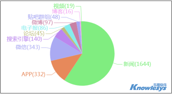 乐思软件舆情监测数据显示,截止目前此次舆情采机来源媒体构成类型中,排在采集来源榜前三位的是新闻、微信和APP。新闻作为重要传播平台,数据量达到1644条,微信和APP分别为343和332条。总的来说,主流新闻媒体和网络媒体组成重要的网络舆论传播和舆情来源平台。
