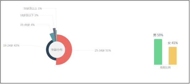 截止目前对于事件舆情的关注,男生比例比女生略高,男生比例59%,在年龄层来说,25-34岁人群占比最大,达到51%,占总人群的5成多,排在第二的是19-24岁,占比42%,占比最小的是50岁及以上的人群,占比仅1%。从人群属性来看,青壮年对于事件舆情更为关注。