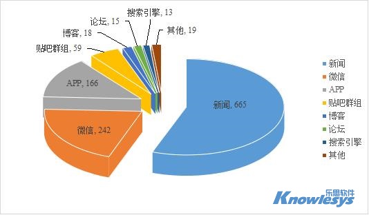 乐思软件舆情监测数据显示,截至目前此次舆情监测媒体构成类型中,排在采集来源榜前三位的是新闻、微信和APP。新闻是重要的信息传播平台,数据量达到665条,微信和APP分别为242和166条。