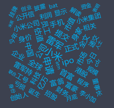 从词云图中可以看出,舆情热度最高的词汇为小米,其次为申请、雷军、ipo、递交和香港等。