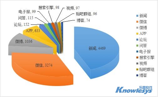 乐思软件舆情监测数据显示,截至目前此次舆情监测媒体构成类型中,排在采集来源榜前三位的是新闻、微信和微博。新闻是重要的信息传播平台,数据量达到4469条,微信和微博分别为3274和1036条。
