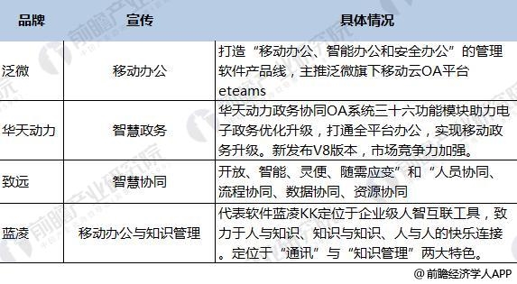 从OA系统厂商的发展上看,泛微、华天动力、蓝凌、致远等OA系统厂商陆续推出成熟的移动端OA系统软件,针对市场变化进行强有力的应对措施。泛微主打“移动办公”,主推旗下移动云OA平台;华天动力主打“智慧政务”,旨在打通全平台办公,实现移动政务升级;致远主打“智慧协同”,提倡开放、智能、灵便等概念;蓝凌主打“移动办公与知识管理”,代表软件“蓝凌KK”则定位于“通讯”与“知识管理”两大特色。