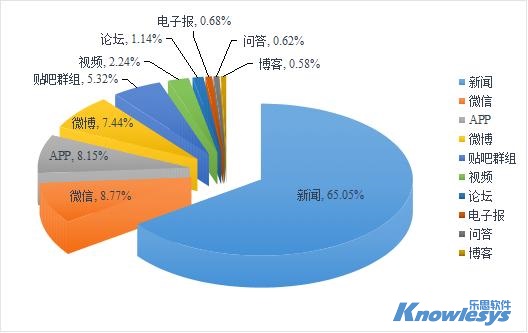 乐思软件舆情监测数据显示,截至目前此次舆情监测媒体构成类型中,排在采集来源榜前三位的是新闻、微信和APP。新闻是重要的信息传播平台,数据占比为65.05%,微信和APP分别占8.77%和8.15%。