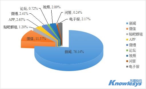 乐思软件舆情监测数据显示,截至目前此次舆情监测媒体构成类型中,排在采集来源榜前三位的是新闻、微信和视频。新闻是重要的信息传播平台,数据占比为76.14%,微信和视频分别占11.57%和2.89%。