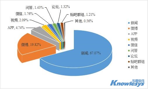 乐思软件舆情监测数据显示,截至目前此次舆情监测媒体构成类型中,排在采集来源榜前三位的是新闻、微博和APP。新闻是重要的信息传播平台,数据占比为67.07%,微博和APP分别占19.82%和4.74%。