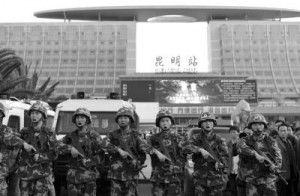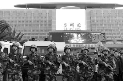 3月1日晚9时20分许,5名歹徒在昆明火车站广场上持刀行凶,不少群众被砍伤,现场乱成一团,情况十分危急。“啪!”事发几分钟后一声清脆的枪声在广场上空响起。