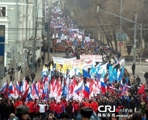 当地时间2014年3月2日,俄罗斯莫斯科,俄民众举行大规模集会,声援在克里米亚的乌克兰人及俄语民众,反对乌克兰新政府,对普京出兵乌克兰表示支持。