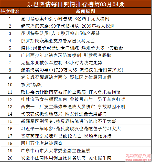 2014年3月4日乐思每日舆情热点排行榜导读:昆明暴恐案40余小时告破 8名凶手无人漏网;起底周滨家族:90年代修祖坟 2009年被人挖洞;昆明特警队员1人15秒开枪击倒5名暴徒;俄罗斯民众集会支持普京出兵乌克兰;媒体:施暴者或受过专门训练 遇难者大多一刀致命……