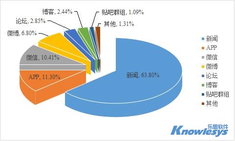 乐思软件舆情监测数据显示,截至目前此次舆情监测媒体构成类型中,排在采集来源榜前三位的是新闻、APP和微信。新闻是重要的信息传播平台,数据占比为63.80%,APP和微信分别占11.30%和10.41%。
