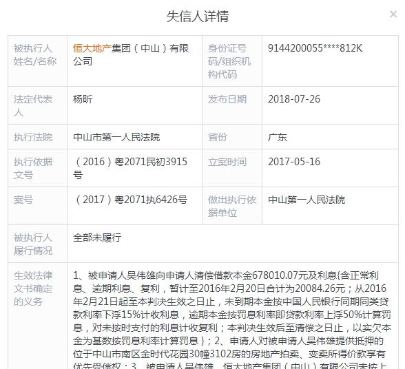 1. 恒大地产集团(中山)公司耍赖被法院列入失信人黑名单