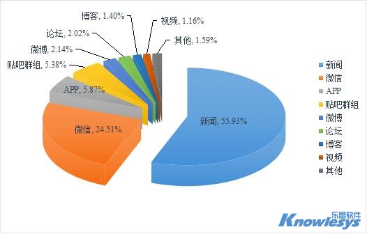 乐思软件舆情监测数据显示,截至目前此次舆情监测媒体构成类型中,排在采集来源榜前三位的是新闻、微信和APP。新闻是重要的信息传播平台,数据占比为55.93%,微信和APP分别占24.51%和5.87%。