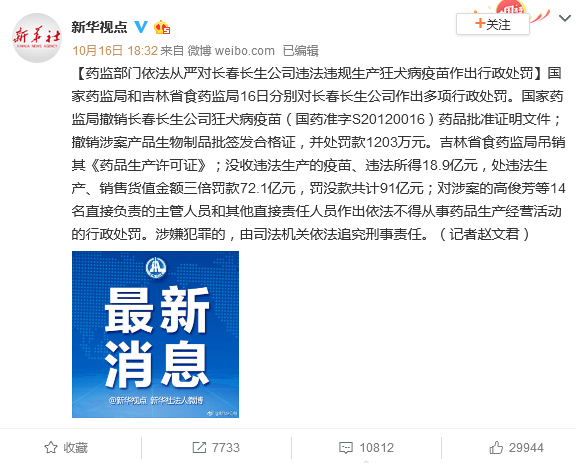 【舆情热点】国家药监局对长春长生罚款91亿元