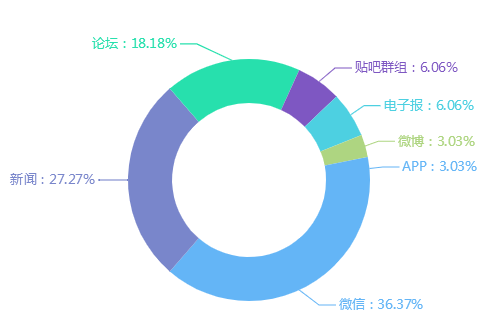 截至10月17日,此次舆情传播媒介分布中,排在采集前三位的是微信、新闻和论坛。微信数据占比为36.37%,新闻和论坛分别占27.27%和18.18%。