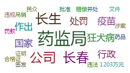 此次舆情事件中,高频词主要是:“药监局”、“公司”、“长生”、“长春”、“处罚”等。
