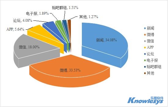 乐思软件舆情监测数据显示,截至目前此次舆情监测媒体构成类型中,排在采集来源榜前三位的是新闻、微博和微信。新闻是重要的信息传播平台,数据占比为34.08%,微博和微信分别占33.53%和18.00%。