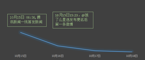 10月15日06:36,腾讯新闻一线首发新闻,随后财经网、搜狐科技、凤凰网、新浪财经等各大媒体纷纷报道该消息,引起网友热议,舆情萌发;15日15:23,@饿了么星选发布更名后第一条微博,当日舆情达到最高峰,随后舆情逐渐呈现下降趋势;截至18日左右,舆情基本平息。