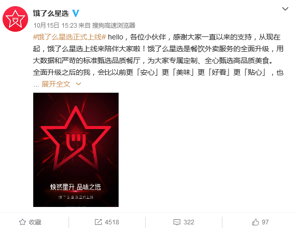 10月15日,百度外卖正式更名为“饿了么星选”,App也采用了新的标识。百度外卖的官方微信和微博也均完成更名。饿了么副总裁王景峰将担任饿了么星选CEO。根据官方介绍,饿了么星选是饿了么旗下严选商家和美食、秉持用户体验至上的高端外卖及生活服务平台。