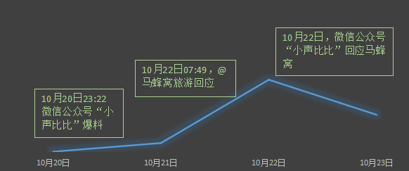 10月20日23:22,微信公众号“小声比比”一篇《独家|估值175亿的旅游独角兽,是一座僵尸和水军构成的鬼城?》的文章引发关注,舆情开始萌发;随后人民网、凤凰网、新浪新闻、@头条新闻、@新京报等各大媒体及官微纷纷报道该消息,引起网友热议,舆情持续攀升;22日07:49,@马蜂窝旅游回应称“文中歪曲事实”,将采取法律手段维护自身权益;同日,微信公众号“小声比比”回应的马蜂窝的公告,并调侃称“四人团队是叫有组织攻击”,称曝光马蜂窝纯属顺手为之,当日舆情达到最高峰;截至10月23日左右,随后舆情逐渐呈现下降趋势。