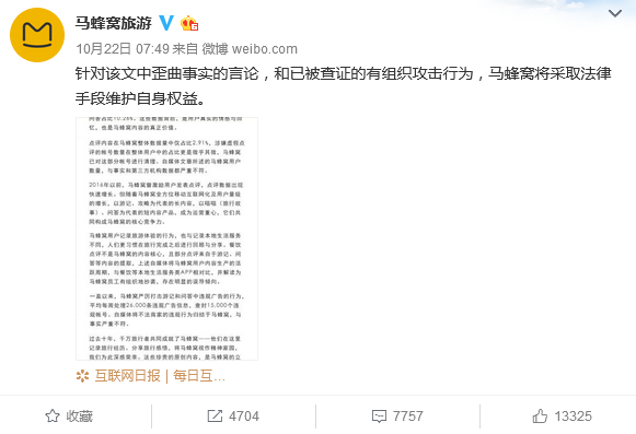 2018年10月20日晚间,微信公众号“小声比比”刊文《估值175亿的旅游独角兽,是一座僵尸和水军构成的鬼城?》,指出主打内容生产的旅游网站马蜂窝大量抄袭。文章揭示,马蜂窝上2100万“真实点评“,里面有1800万条是机器人从竞争对手抄袭而来,甚至连抽奖活动中奖的都是抄袭账号。10月22日,马蜂窝对于这一传言进行了正面回应。马蜂窝的公告中指出,他们将对文中歪曲事实的言论和有组织的攻击行为采取相关的法律手段。
