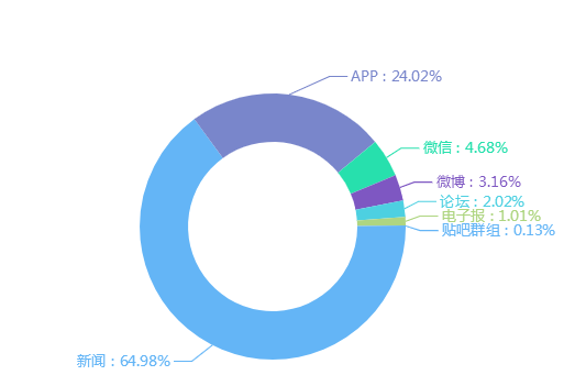 截至10月23日,此次舆情传播媒介分布中,排在采集前三位的是新闻、APP和微信。新闻数据占比为64.98%,APP和微信分别占24.02%和4.68%。