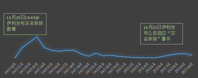 10月24日10:49,@伊利发布实名举报微博,随后人民网、腾讯财经、凤凰网、新浪等各大媒体纷纷报道该消息,引起网友热议,舆情持续攀升,当日13点左右,舆情达到最高峰,随后开始回落;25日,伊利发布公告回应“实名举报”事件称“相关举报不涉及公司应披露而未披露的重大消息。目前管理团队稳定,生产经营正常”,25日9点左右,舆情呈现一个小高峰,截至25日,舆情总体态势趋于和缓。