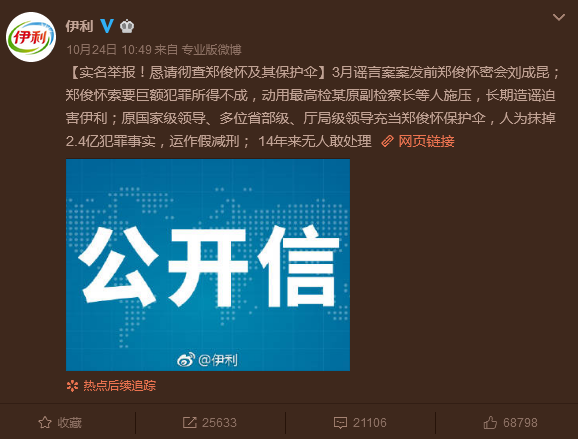 10月24日,伊利集团官方发布公开信,实名举报前董事长郑俊怀。文章称,今年3月谣言案案发前,郑俊怀北京密会刘成昆,诋毁伊利的谣言文章随即出炉。索要巨额犯罪所得不成,造谣伊利套路十几年如出一辙。原国家级领导、多位省部级领导、厅局级领导充当郑俊怀保护伞,人为抹掉郑俊怀数亿元犯罪事实,运作假减刑。