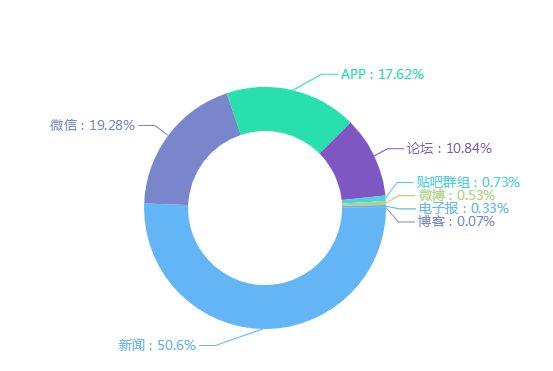 截至10月25日,此次舆情传播媒介分布中,排在采集前三位的是新闻、微信和APP。新闻数据占比为50.6%,微信和APP分别占19.28%和17.62%。
