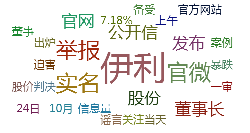 此次舆情事件中,高频词主要是:“伊利”、“举报”、“实名”、“官微”、“董事长”等。