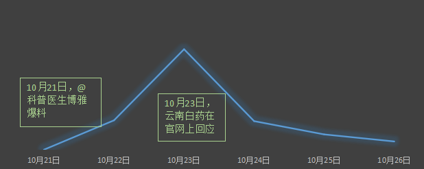 10月21日,@科普医生博雅爆料,随后财经网、搜狐、人民网、凤凰网等各大媒体纷纷报道该消息,引起网友热议,舆情持续攀升;10月23日,云南白药在官网上发布“ 关于云南白药牙膏相关情况的说明 ”,当日舆情达到最高峰;随后舆情逐渐呈现下降趋势;截至26日左右,舆情基本平息。
