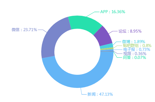 截至10月26日,此次舆情传播媒介分布中,排在采集前三位的是新闻、微信和APP。新闻数据占比为47.13%,微信和APP分别占23.71%和16.36%。