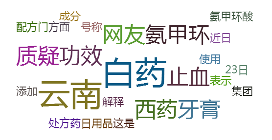 此次舆情事件中,高频词主要是:“白药”、“云南”、“西药”、“质疑”、“止血”等。