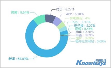 乐思软件舆情监测数据显示,截至目前此次舆情监测媒体构成类型中,排在采集来源榜前三位的是新闻、微博和微信。新闻媒体是最重要的信息发布平台,数据占比为64.09%,微博和微信分别占9.64%和8.27%。