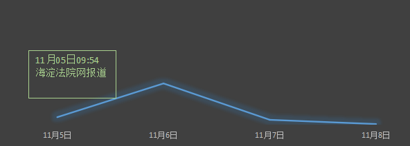 11月5日 09:54海淀法院网首发消息,随后人民网、凤凰网、新浪、环球网等各大媒体纷纷报道该消息,引起网友热议,舆情持续攀升,11月6日,舆达到最高峰;接着舆情呈下降趋势,截至11月8日,舆情基本平息。