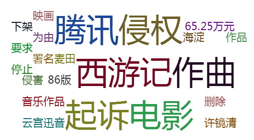 此次舆情事件中,高频词主要是:“西游记”、“作曲”、“起诉”、“腾讯”、“侵权”等。