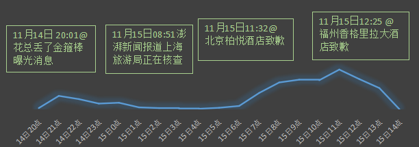 11月14日 20:01@花总丢了金箍棒曝光消息;随后@人民日报、@新京报、@头条新闻、@新浪财经、凤凰网、新浪新闻等各大媒体及官方微博纷纷报道该消息,引起网友热议,舆情萌发;11月15日08:51澎湃新闻报道上海旅游局正在核查,11:32@北京柏悦酒店致歉,12:25 @福州香格里拉大酒店致歉,舆情持续攀升,到11月15日11点左右,舆达到最高峰;接着舆情持续下降,截至11月15日14点,舆情整体呈下降趋势。
