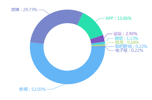 截至11月15日,此次舆情传播媒介分布中,排在采集前三位的是新闻、微博和APP。新闻数据占比为52.03%,微博和APP分别占29.73%和13.06%。