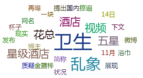 此次舆情事件中,高频词主要是:“卫生”、“乱象”、“五星”、“酒店”、“视频”、“花总”等。