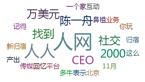 此次舆情事件中,高频词主要是:“人人”、“人网”、“CEO”、“陈一舟”、“社交”等。