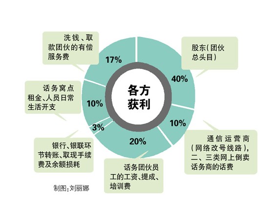 据饼图显示,100亿元被骗走的话,过程中银行收取多级转账、取现手续费等费用,会有3亿元左右的收益。