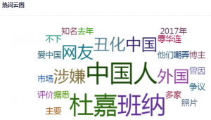 通过对新浪微博官方认证号@头条新闻 发布的“【D&G辱华连外国网友都看不下去了 其实去年他们就曾丑化中国人】”的微博进行分析发现,此舆情事件的核心词为“中国人”、“杜嘉班纳”,另外,还有“辱华”、“丑化”、“嘲弄”等负面感情色彩的词。
