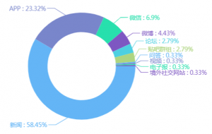 目前,此舆情被新闻媒体报道的数量占比为58.45%,其次是APP,占比为23.30%,微信和微博两者之和为11.5%,这些平台为舆情的主要传播媒介。