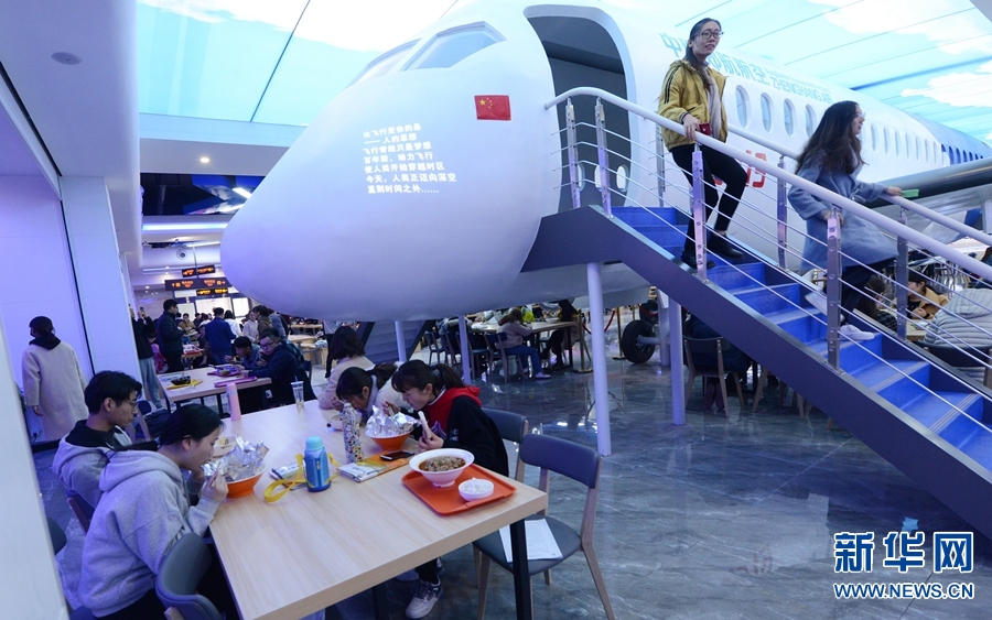 11月28日报道,郑州,近日,郑州航空工业管理学院打造了一个航空主题餐厅,一架国产C919飞机模型亮相东苑餐厅三楼,售饭窗口“变身”值机柜台,“国内航班候机区”导视牌,以及星空顶灯,餐厅的各个细节都给人一种登机的真实感,吸引了许多学生前来参观体验、就餐。