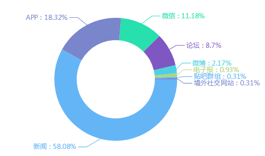 截至12月6日,此次舆情传播媒介分布中,排在采集前三位的是新闻、APP和微信。新闻数据占比为58.08%,APP和微信分别占18.32%和11.18%。