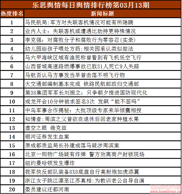 2014年3月13日乐思每日舆情热点排行榜导读:马民航局:军方对失联客机情况可能有所隐瞒;业内人士:失联客机或遭遇比劫持更特殊情况;李克强:对腐败分子和腐败行为零容忍(实录);幼儿园给孩子喂处方药:相关园承认类似做法;马六甲海峡区域有渔民称曾看到有飞机低空飞行……
