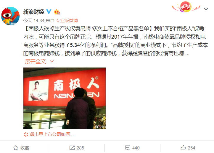 消费者从网上买到的南极人“品牌货”,很可能不是“正品”,商家只是挂了牌子的羊头,卖了贴牌的狗肉。这一报道顿时引发了众多网友的热议,有人戏称他们“不生产商品,只是标牌的搬运工”,也有消费者表示自己此前买东西时出于信任会认准这些大品牌,但现在却不敢再相信这些牌子了。