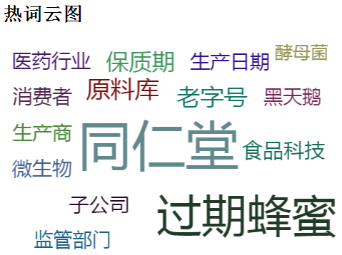 本次事件,热点最高的词为“同仁堂”、“过期蜂蜜”、“老字号”、“原料库”、“黑天鹅”。