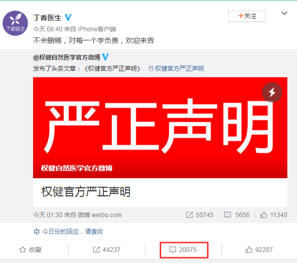 在权健公司发布的微博公告中,评论量5000+时被关闭评论功能,有网友称权健公司此举未免心虚。加上众多媒体的添油加醋,舆论旋涡越转越大,处于漩涡中心的权健公司将如何应对态度如此强势的丁香医生?这场舆论战来势汹汹,现在声势较弱的权健会采取什么方法应对?我们先静观其变,后期将持续监测。