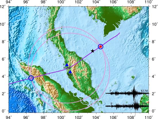 中国科学技术大学地震与地球内部物理实验室温联星研究组在马来西亚与越南交界海域检测到一次海底事件。事件发生于当地时间2014年3月8日2点55分6秒,其中可能的两个地点之一位于北纬7度25分、东经104度30分,距离当日马来西亚飞往北京的MH370航班最后失联时间(1点30分)后约一个半小时,最后失联地点的东北方向约116公里(72英里)。该海域是无地震区,因此根据两件事件的发生时间和地点判断,所检测到的海底事件有可能是马航MH370航班坠海失事所造成。