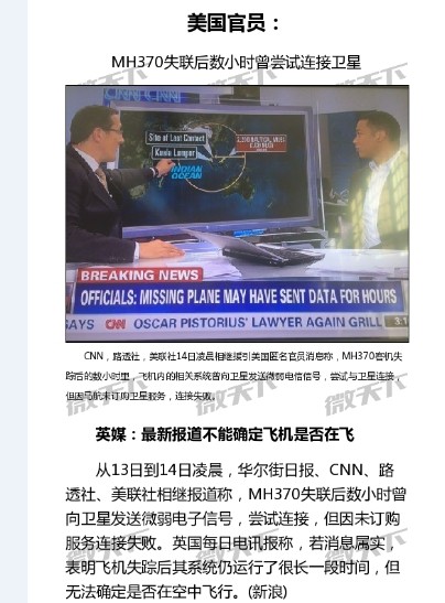 CNN报道,美官员13日说,美方已开始在印度洋搜索失联马航客机。报道称,美官员与马来西亚进行了信息共享,根据所掌握的信息,相信飞机飞到了印度洋。海军第七舰队指挥官威廉·马克说,应马来西亚政府请求,美海军“基德”导弹驱逐舰正开往印度洋。